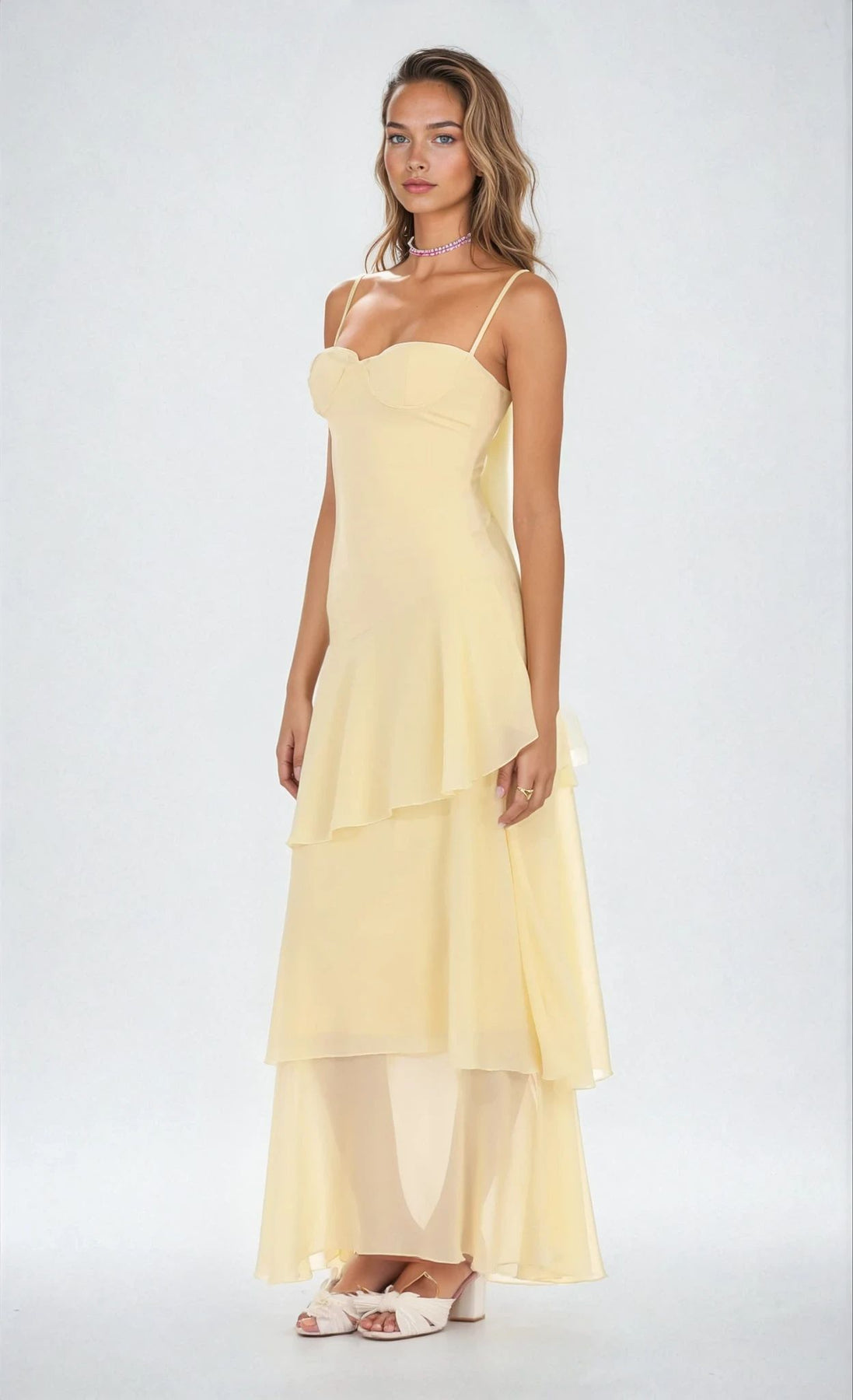 Ethereal and sun-kissed, the Soleria Maxi Dress features delicate spaghetti straps and cascading chiffon ruffles in a soft yellow hue. A graceful silhouette that moves like sunlight perfect for summer soirées or romantic evenings.